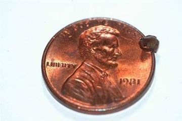 Freshly metamorphosed, a baby micro frog sits on a penny.